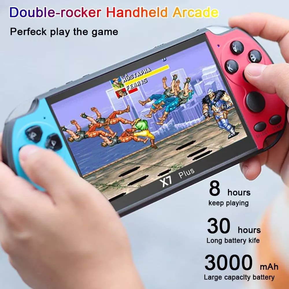 X7PLUS Game console*1, TV cable*1, manual*1, earphone*1, USB MINI-B cable/charging cable*1,
